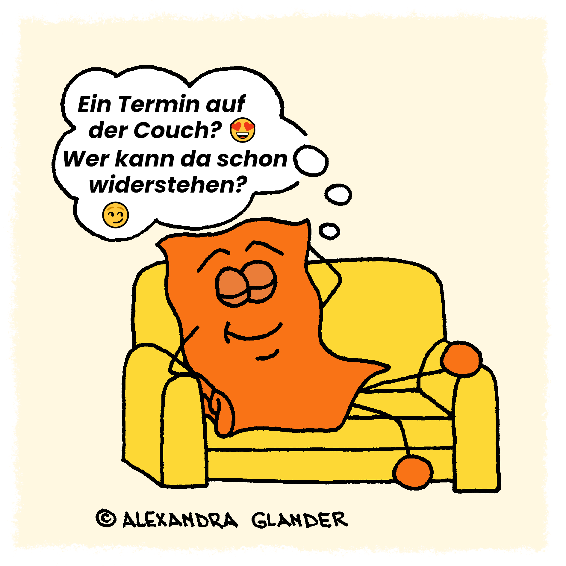 Vielleicht ergibt es ja sogar noch viel mehr Sinn, ein Gespräch im Schneidersitz zu machen. So kommt der Jammerlappen erst gar nicht auf die Idee, das Gespräch vereiteln zu wollen – es wird ja gemütlich. Und Spiel und Spannung ist auch mit dabei, weil niemand weiß vorm Termin, was sie oder ihn erwartet und für welche Couch wir uns entscheiden. 😁